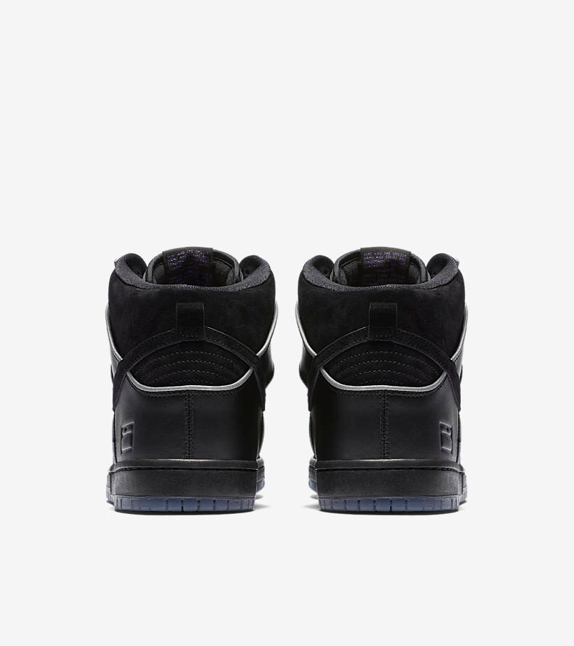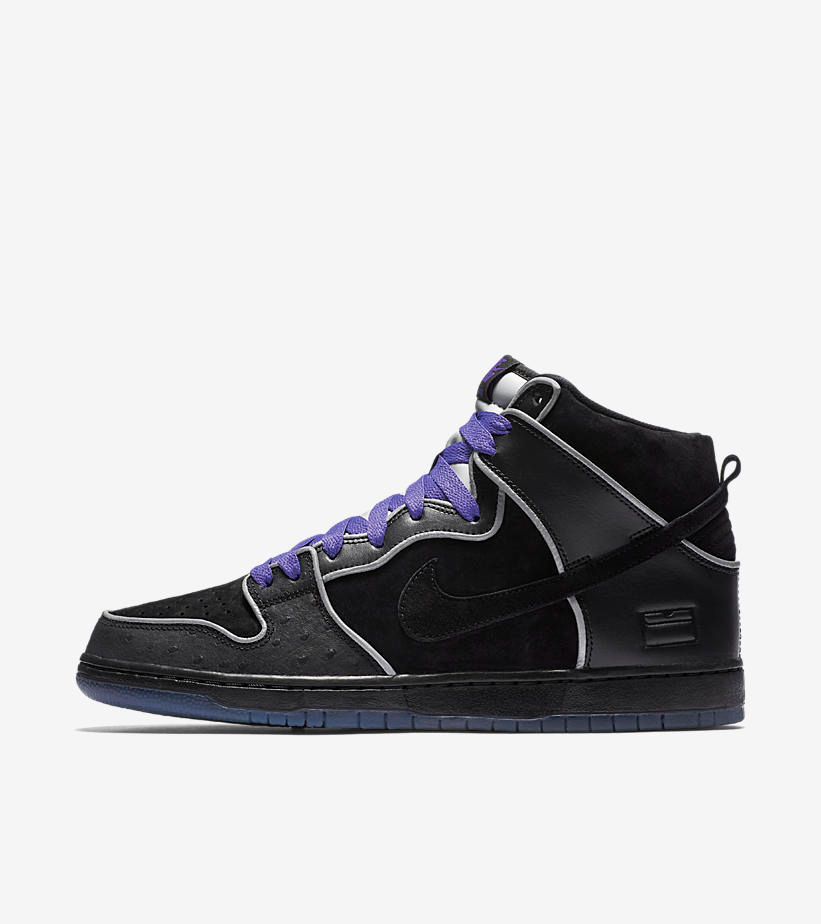 A versão de cano alto, mescla couro liso, couro com textura de avestruz e camurça preto com detalhes prata em 3M; seu cadarço é roxo na mesma tonalidade do Nike SB estampado na caixa. Há ainda, quem comparou esse tênis com o Dunk High MF DOOM que foi lançado uns anos atrás e eles realmente são muito semelhantes.