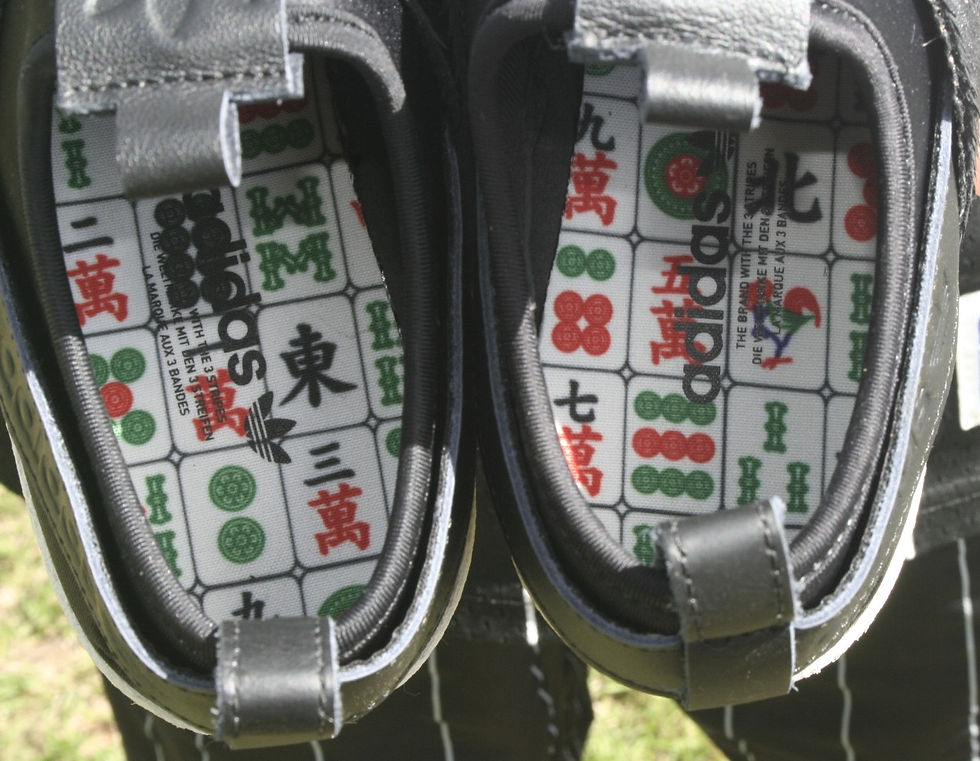 Para caprichar na história do tênis, a palmilha tem inscritos e imagens de origem chinesa, sem contar no chaveiro que acompanha o calçado, nada mais nada menos que uma peça de Mahjong, um dos mais tradicionais jogos chineses.