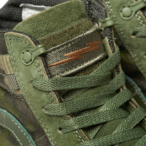 Novamente a silhueta resgatada para a collab foi a versão Notchback do Sk8-hi, porém, dessa vez em três cores, Preto, Tan e Verde Oliva.