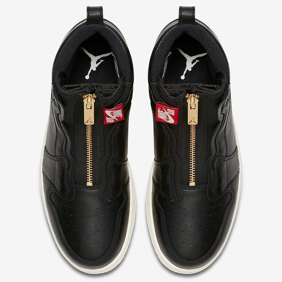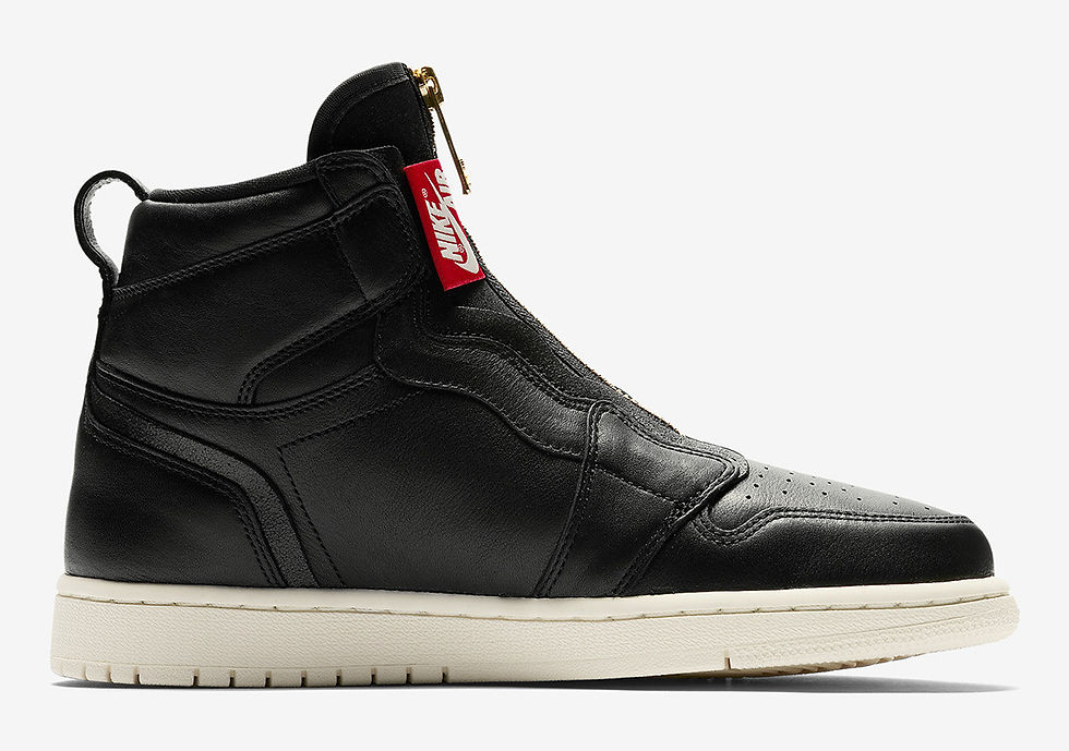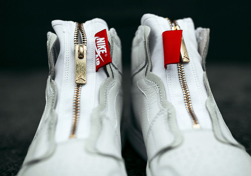 Exclusivo para mulheres, o Air Jordan 1 "Zip" faz jus ao nome, pois carrega em si um grande zíper dourado chamativo, com rápido e fácil fechamento. Esse componente em conjunto com o puxador no calcanhar tornam ele um tênis bem fácil de calçar, quando comparado com outros Air Jordans. Como o foco do tênis é o zíper em si, a Nike escolheu duas cores básicas - branca e preta - sem muitos detalhes adicionais, com apenas uma etiqueta "Nike Air" vermelha na parte interna do tornozelo.