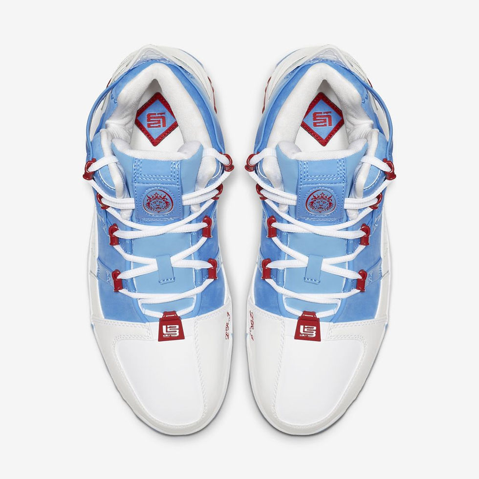 O high-top vem com cabedal de couro nobuck em azul. Couro branco envernizado é usado na toe box, em uma parte da entressola e no calcanhar. Um detalhamento em vermelho pode ser visto em diversas partes do par, como os passadores, o Swoosh e a sola. As iniciais de LeBron, "LRJ", estão costuradas na lateral em vermelho e estrelas vem estampadas nos painéis do calcanhar, completando esse design especial.