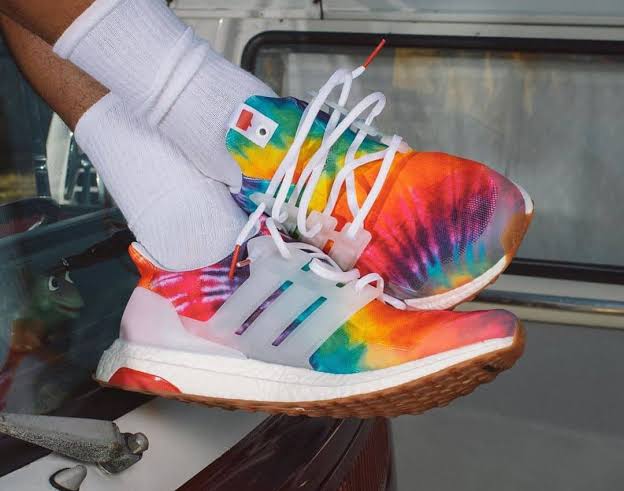 A colaboração trabalha com uma estampa tie-dye em seu cabedal, em conjunto com uma cage branco translúcido e um suporte no calcanhar também branco, complementados por uma entressola Boost e um solado gum. Detalhes adicionais incluem o logo Nice Kicks decorando a língua do pé direito e palmilhas personalizadas.