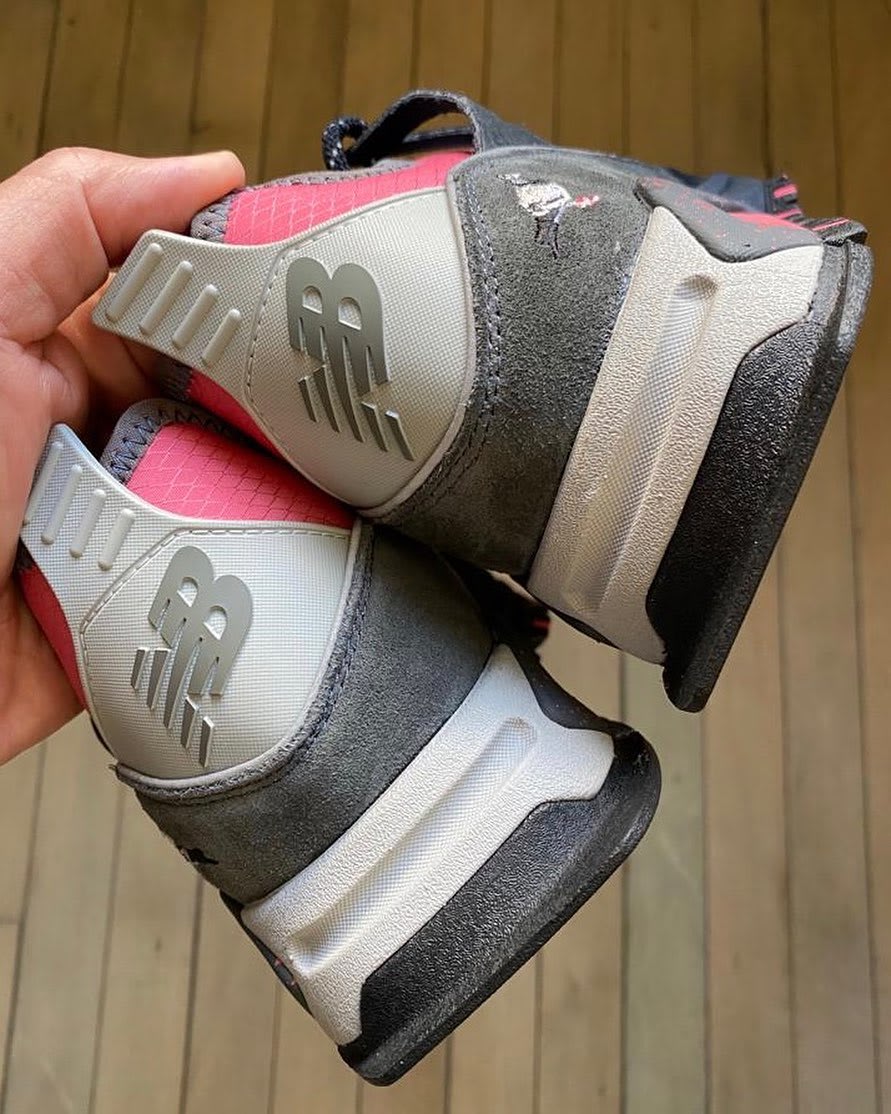 A tripla colaboração apresenta cabedal com tons em cinza, camadas em preto e detalhes em rosa. O logo "N" na lateral aparece em roxo e o famoso pombo da marca Staple aparece na região lateral próxima ao calcanhar.