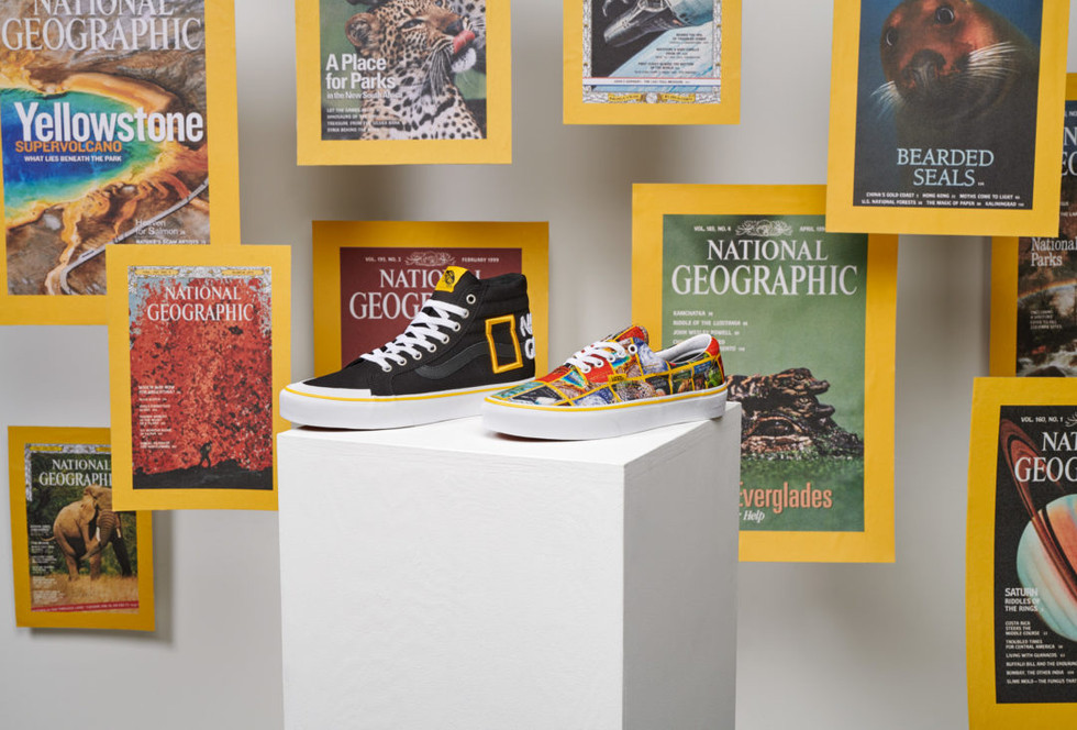 A coleção de tênis composta por seis silhuetas Era, Sk8-Hi 138, Authentic, Old Skool e o UltraRange EXO (em duas cores alternadas), todos eles customizados com estampas únicas e exclusivas da colaboração entre a Vans e a National Geographic. Os heróis da coleção são o Era, coberto por uma estampa completa de capas icônicas da Nat Geo do passado e o Sk8-Hi 138 Reissue. Tão reconhecível quanto a tradicional Sidestripe, a borda amarela da National Geographic inspira o espírito de aventura e descoberta sem limites. Ambos os logos são unidos e orgulhosamente apresentados no Sk8-Hi 138, costurados cuidadosamente no cabedal desenvolvido em nylon ripstop.