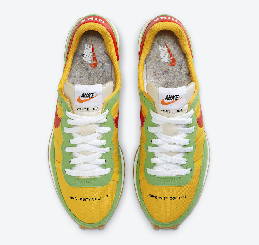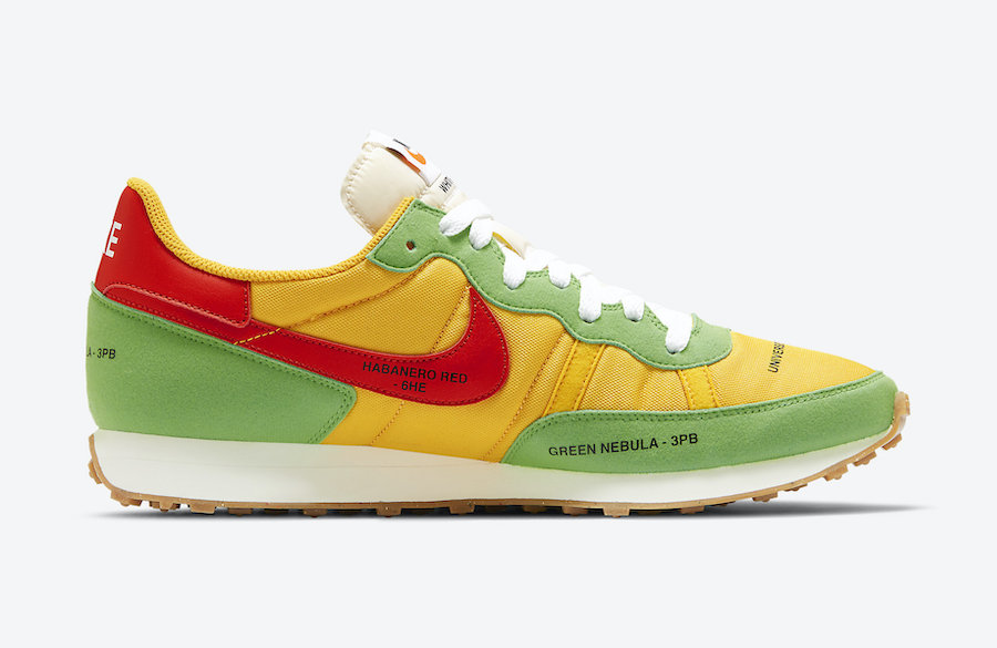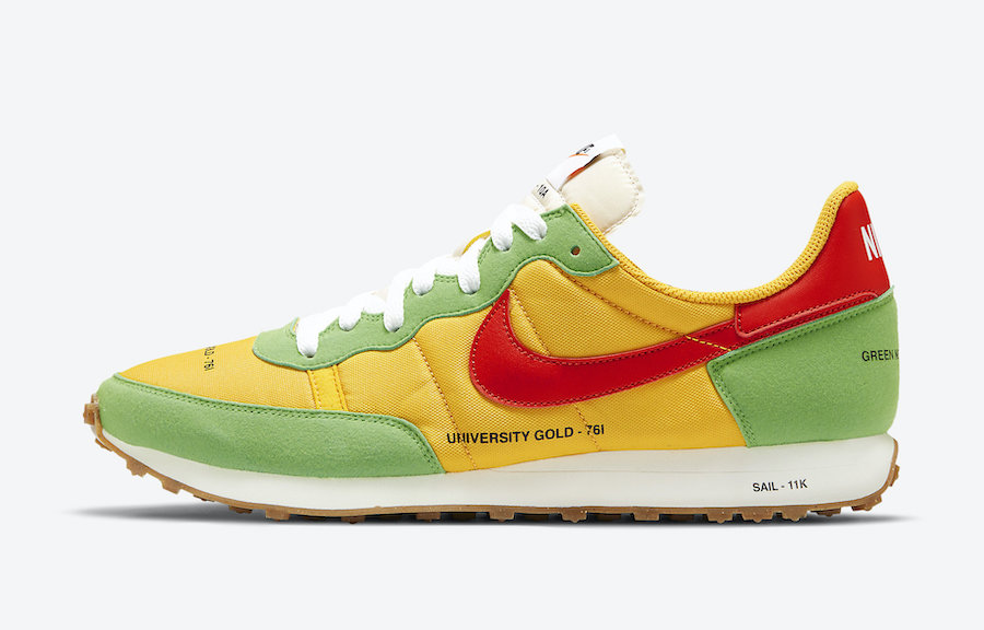 Com um mix de amarelo, verde e vermelho, o Nike Challenger tem cabedal em malha, camurça, couro e detalhes em nylon. A cor foi descrita por cima do cabedal, pegando inspiração de outros packs que já vimos recentemente.