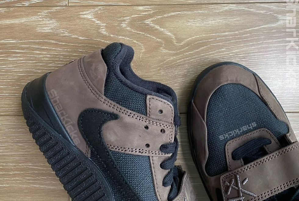 O tênis apresenta construção em lona preta com sobreposições em camurça marrom, destaque para a parte superior com o strap de velcro onde temos o logo do rapper. O toque especial fica por conta do swoosh invertido em couro preto, assinatura de Scott presente na lateral e o emblema de Cactus Jack no calcanhar traseiro.
