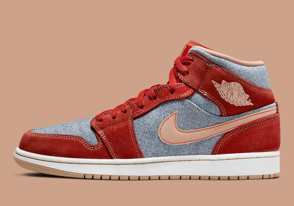 A edição apresenta construção em jeans claro com sobreposições em camurça vermelha. Detalhes extras na cor bege aparecem no swoosh, logo Jumpman na língua, Wings na lateral e no solado, dando um ar premium para o modelo.