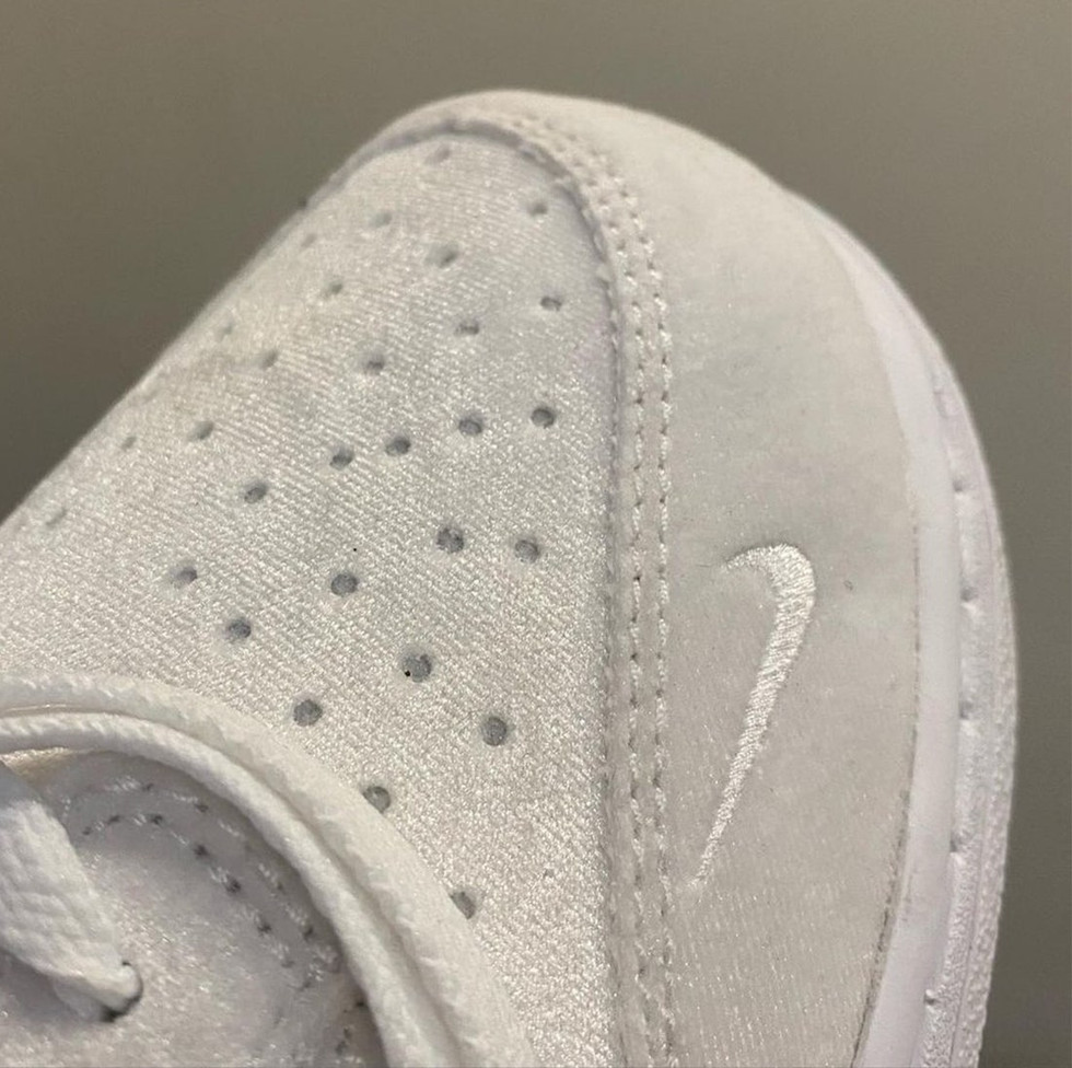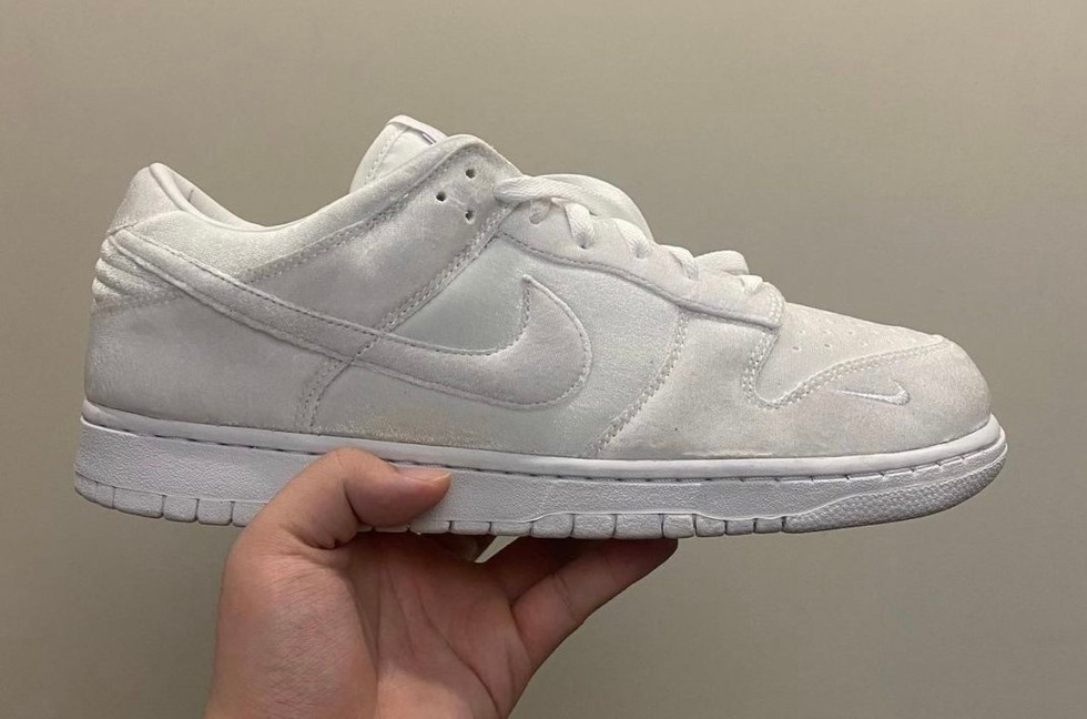 Ao que tudo indica, a nova colab terá três cores, sendo uma "Triple Black", uma "Triple White" e uma "Black/White", até o momento temos imagens apenas da versão toda branca. Podemos ver que a construção é toda de veludo, lembrando o que vimos na versão "Strangelove" da linha SB, outros detalhes incluem um mini swoosh no bico do pé e palmilhas personalizadas com o logo da DSM.