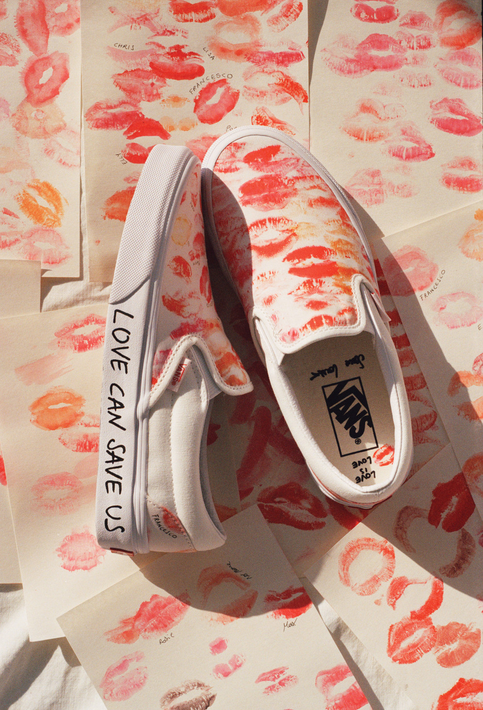 Celebrando o amor em todas as suas formas, a coleção OTW Gallery dessa temporada apresenta a arte da fotógrafa italiana, Sara Lorusso, no Classic Slip-On. Coberto por nomes, impressões de beijos de amigos e a mensagem “LOVE CAN SAVE US”, traduzido em português para “O AMOR PODE NOS SALVAR” escrito na vira lateral de borracha, a silhueta sem cadarços é finalizada pela fotografia de Lorusso numa das palmilhas e em ambas as solas do Slip-On.